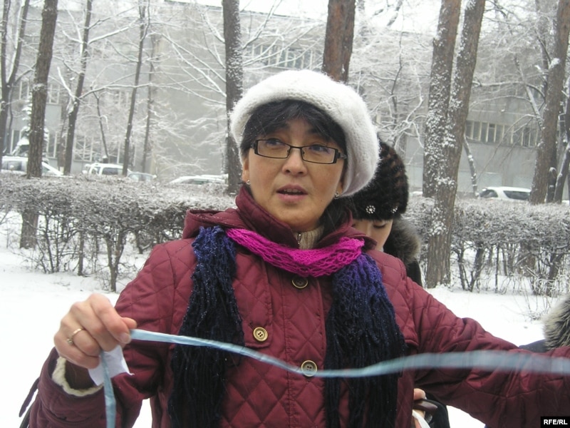 Бахытжан Торегожина, руководитель общественного фонда "Ар.Рух.Хак" во время акции против пыток. Алматы, 4 февраля 2010 года.