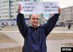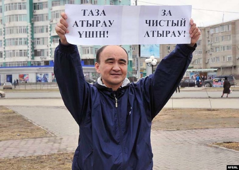 На площади возле Академии искусств имени Дины Нурпеисовой 10 апреля общественный деятель и лидер неправительственной организации «Арлан» Макс Бокаев вышел с плакатом: «За чистый Атырау!» Вокруг него собралось около десятка молодых людей. Протест, как сказал Макс Бокаев нашему радио Азаттык, выражен против строительства в черте города опасного производственного объекта.