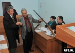 Истец Толеген Сагындык (слева) с адвокатом демонстрируют в суде ружейную приставку, которая принадлежала его предку. Атырау, ноябрь 2009 года.