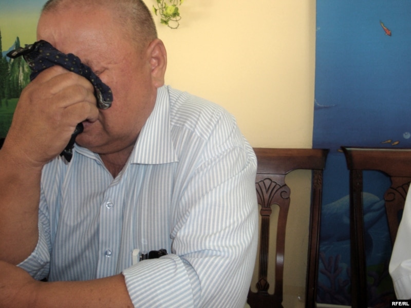 Халидолла Шолаков вытирает слезы, вспоминая брата Кабидоллу Шолакова, который cжег себя. Атырау, сентябрь 2009 года.