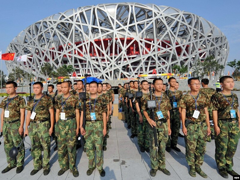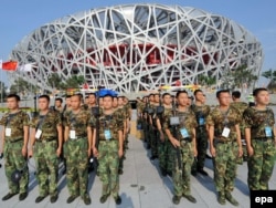 Китайские солдаты на фоне стадиона в Пекине. 5 августа 2008 года.