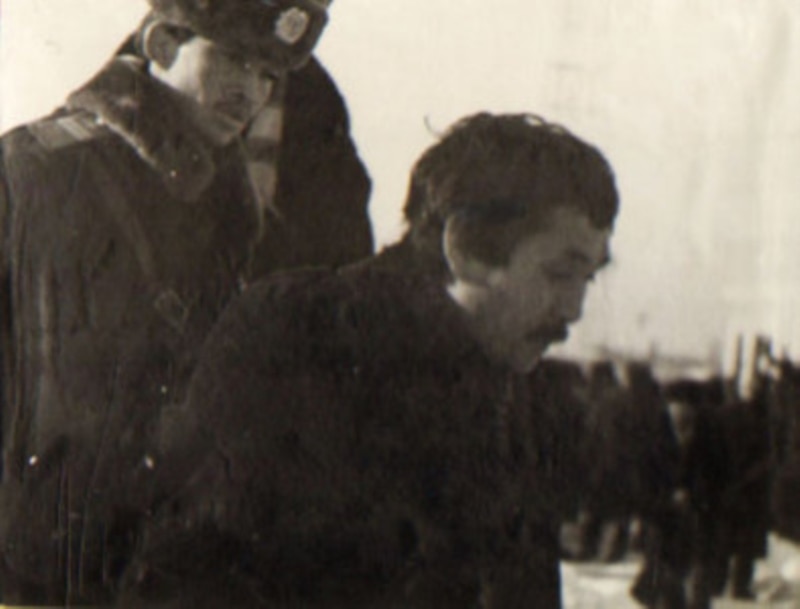 Сержант советской милиции и задержанный участник Декабрьских событий 1986 года в Алматы. Фото предоставлено Центральным государственным архивом Алматы.