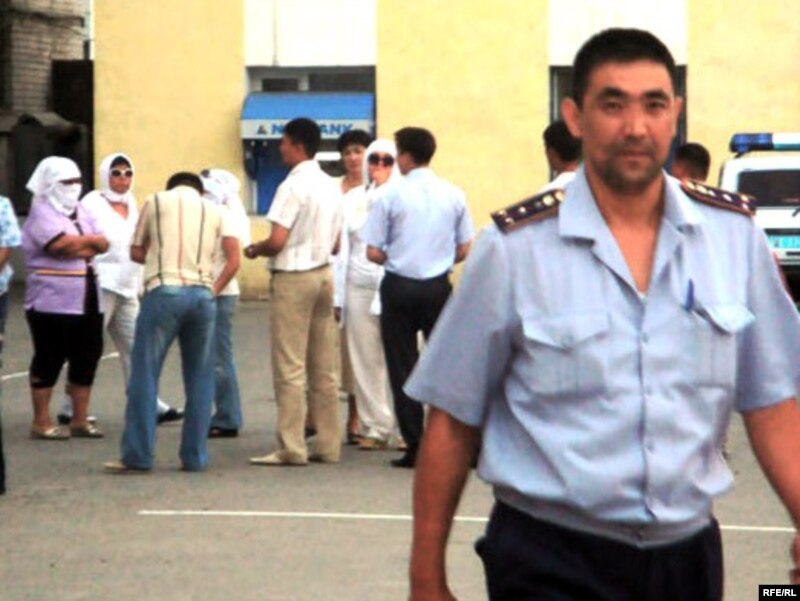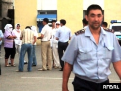 Полицейский на фоне пикетирующих матерей подсудимых молодых людей у здания областного суда. Атырау, 16 июня 2010 года.