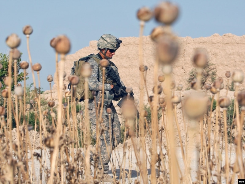 Американский солдат патрулирует на маковом поле в селе Бала Балук, провинция Фарах, Афганистан. 28 мая 2010 года.