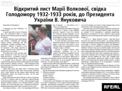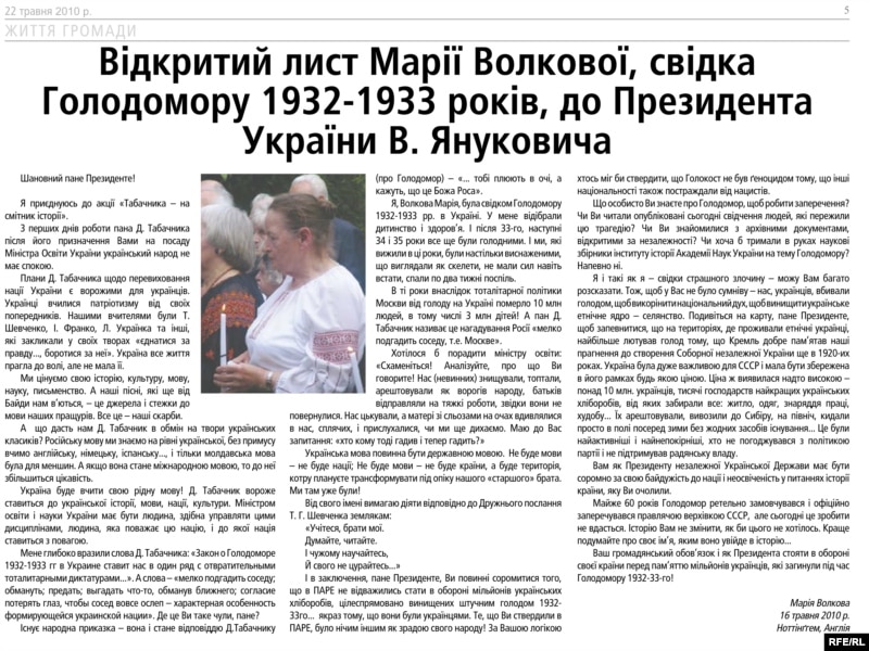 Украинка Мария Волкова, проживающая сейчас в Великобритании, обратилась на прошлой неделе с открытым письмом к президенту Украины Виктору Януковичу. Это письмо поместила британская украинская газета «Украинська Думка». Причиной письма стала реакция Виктора Януковича в Совете Европы в Страсбурге, где президент открыто отрицал, что Голод 1932–1933 годов был геноцидом украинского народа.