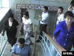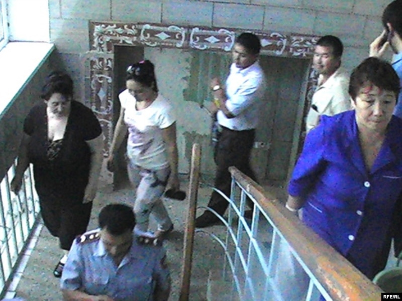 Участники процесса по делу квартирного мошенничества спускаются по лестнице в здании больницы. Актобе, 23 июня 2010 года.