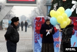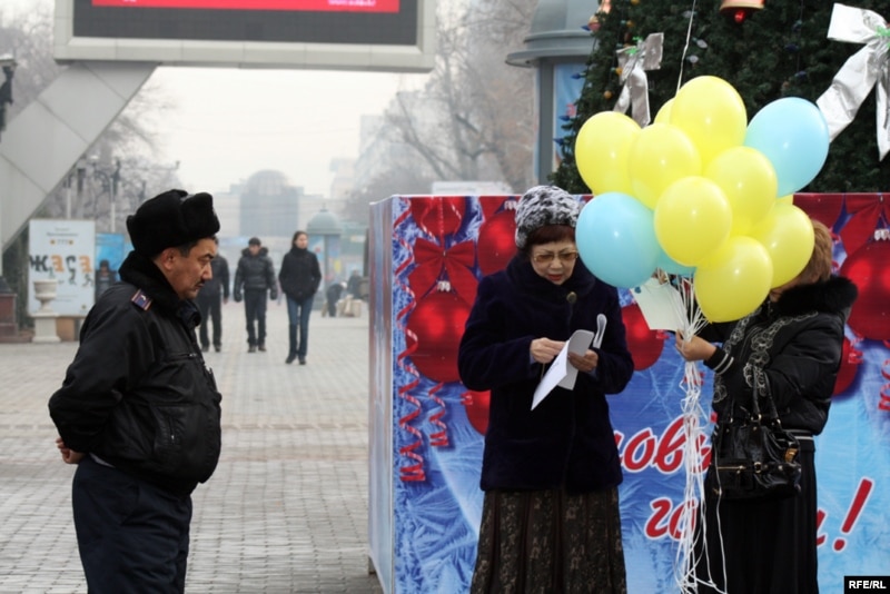 Полицейский наблюдает за Розланой Таукиной, руководителем прессозащитной организации «Журналисты в беде», и Раушан Есергеповой, женой осужденного журналиста Рамазана Есергепова. Алматы, 6 января 2010 года