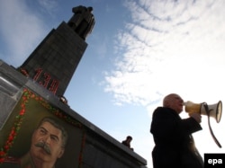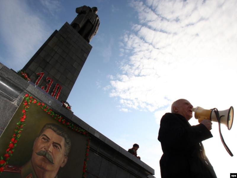 Житель города Гори декларирует лозунги у памятника Сталину в ходе празднования дня его рождения. Гори, 21 декабря 2009 года.