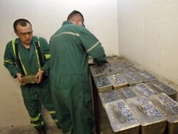 Рабочие рудника Кумтор складывают золото в слитках. 1 июня 2011 года.