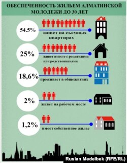 Несмотря на то, что в Казахстане для реализации программы «Доступное жилье - 2020» ежегодно выделяются значительные суммы, в самом крупном городе страны – Алматы – проблема обеспеченности жильем молодых остается нерешенной. По данным исследования, проведенного центром Public Policy Research, в Алматы 54,3 процента молодежи до 30 лет живет на съемных квартирах, 18,6 процента проживает в общежитиях, 25 процентов живет вместе с родителями или родственниками. Два процента живет на рабочем месте. Свое жилье имеет только 1,2 процента молодежи.