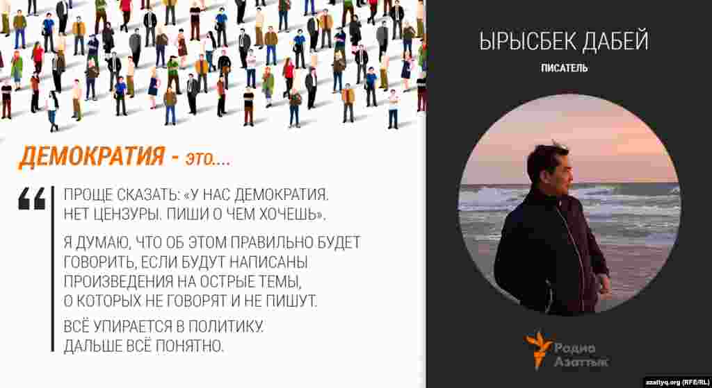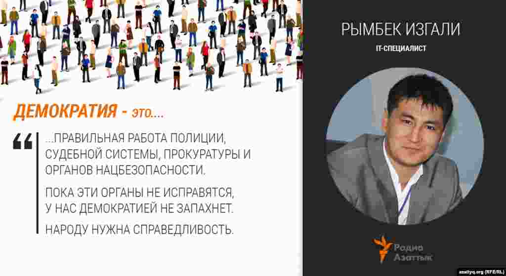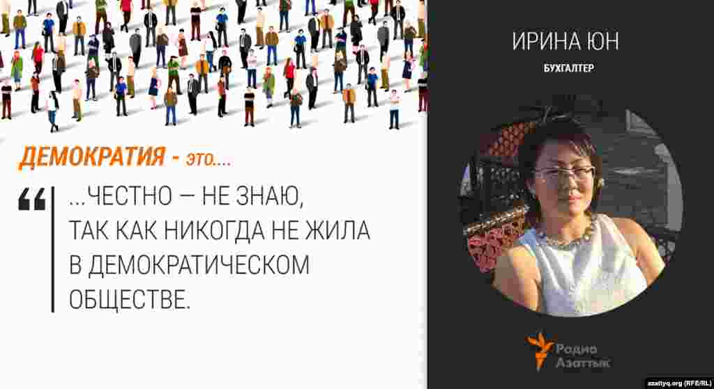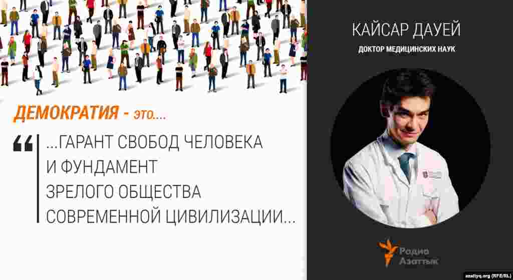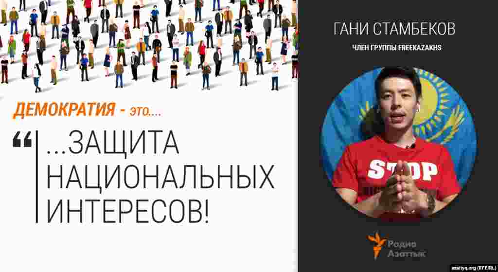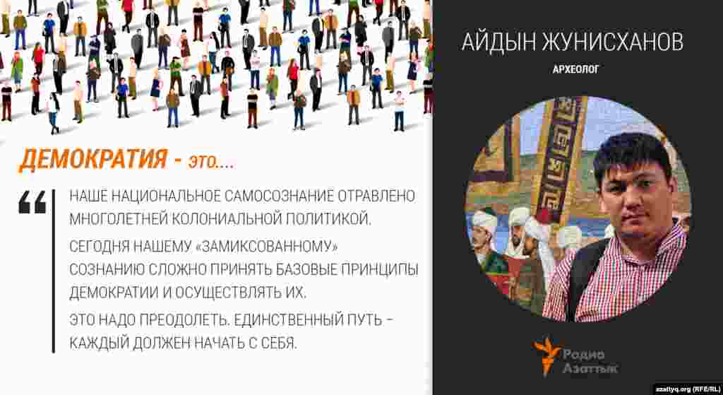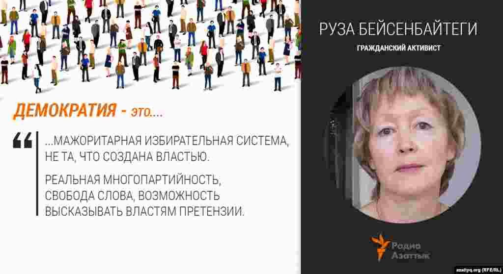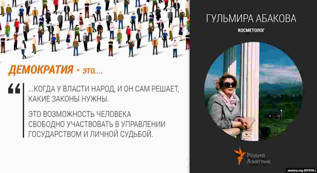 Азаттык спросил казахстанцев, что они понимают под словом «демократия». 15 сентября, в Международный день демократии, мы собрали точки зрения разных людей — активных, творческих и просто рядовых казахстанцев — в одной галерее.