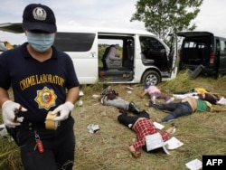 Полицейский на месте расстрела похитивших боевиками людей. Число погибших в результате нападения боевиков возросло до 57 человек. Среди них были журналисты и политики. Ампатуан, Филиппины, 24 ноября 2009 года.
