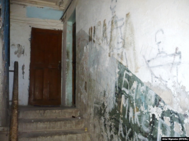 Квартира Мырзабай Лесова в старом двухэтажном доме 1966 года постройки. У ветхого строения разваливается фундамент, подъезд дома в ужасном состоянии: без дверей, окна на лестничной площадке разбиты, штукатурка почти вся отвалилась и чувствуется стойкий запах испражнений.