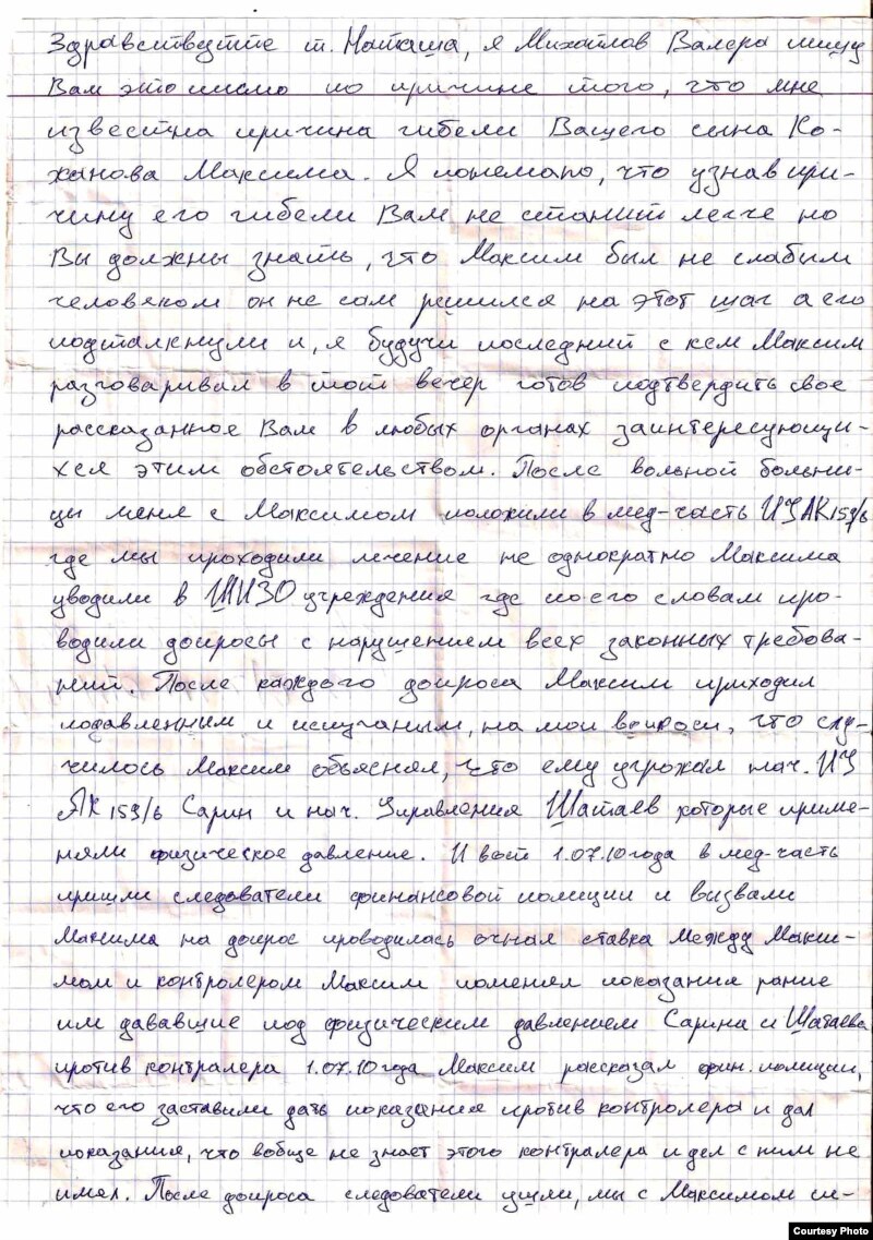 Предположительно заключенный Валерий Михайлов утверждает в своем письме, что самоубийству Максима Кожанова якобы