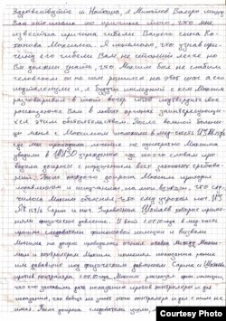 Фотокопия первого листа письма заключенного Валерия Михайлова к матери Максима Кожанова, представленная Вадимом Курамшиным журналистам. Караганда, 28 сентября 2010 года. Автор фото - правозащитник Андрей Цуканов.