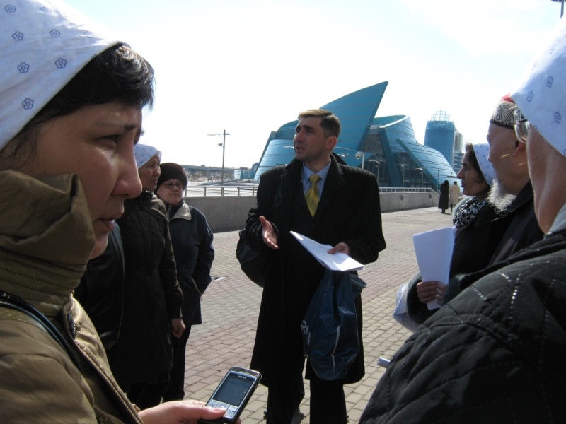 Правозащитник Вадим Курамшин стоит в окружении родственников осужденных. Астана, 1 апреля 2011 года.