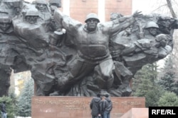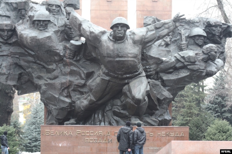 Студенты возле монумента 28 гвардейцам- панфиловцам. Алматы, 23 февраля 2010 года.