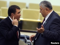 Бывший министр обороны Мухтар Алтынбаев (справа) говорит с вице-министром обороны Асетом Курмангалиевым в стенах парламента. Астана, 9 июня 2011 года.
