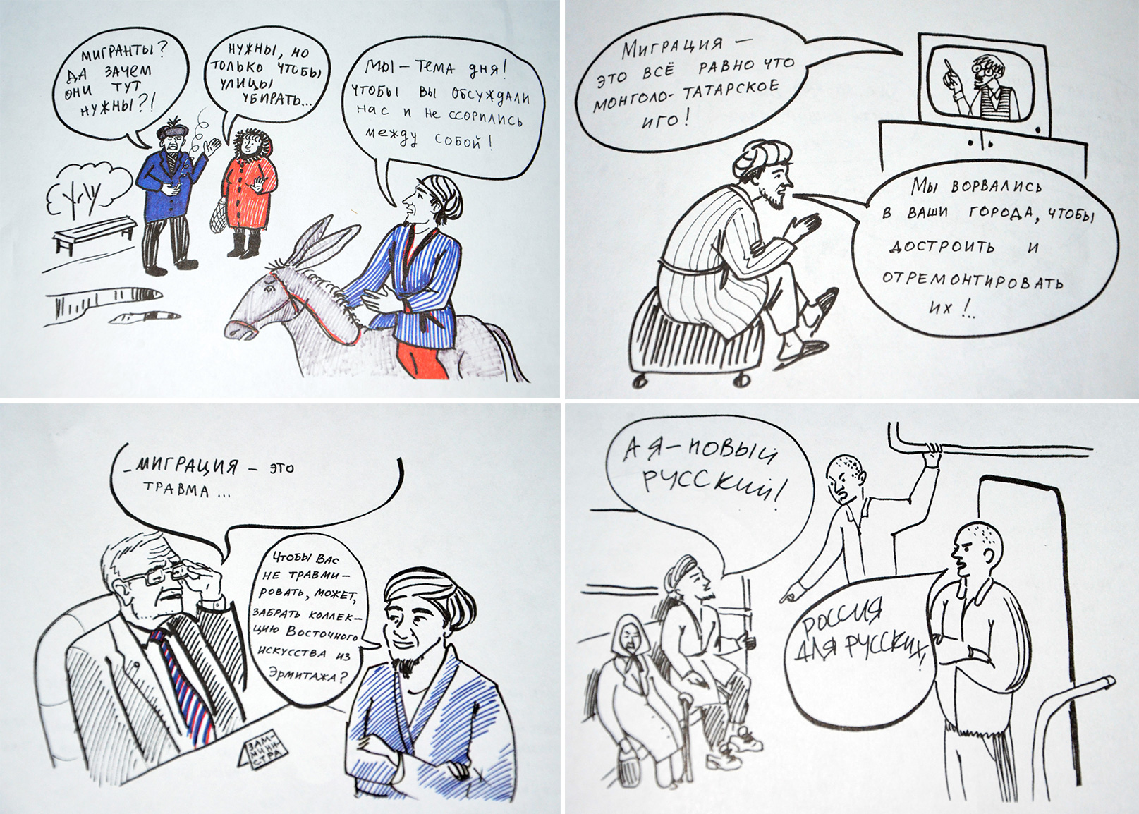 Ольга Житлина из Санкт-Петербурга представила газету «Насреддин в России». На первой странице говорится, что это совместный проект группы трудовых мигрантов и питерских художников. В каждом выпуске — карикатуры, комиксы, тексты. Ее основной герой — фольклорный персонаж Ходжа Насреддин, отправившийся в Россию на заработки.