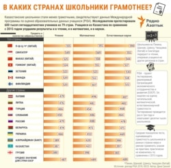 Казахстанские школьники показали результаты ниже средних по итогам тестов в рамках международной программы по оценке образовательных достижений учащихся (PISA) Организации экономического сотрудничества и развития. Казахстан не вошел в топ-50 стран рейтинга PISA. Эксперты считают, что без упорядочения системы образования, которую сотрясают постоянные реформы, ожидать улучшений не стоит. В министерстве образования и науки полагают, что к 2021 году результаты Казахстана будут выше нынешних.