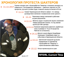 В морозные дни декабря 2017 года несколько шахт компании «АрселорМиттал Темиртау» в Карагандинской области встали на забастовку. Шахтеры отказались работать, выдвинув почти три десятка требований работодателю и властям.
