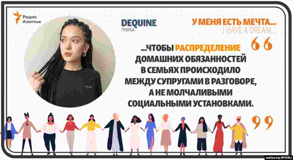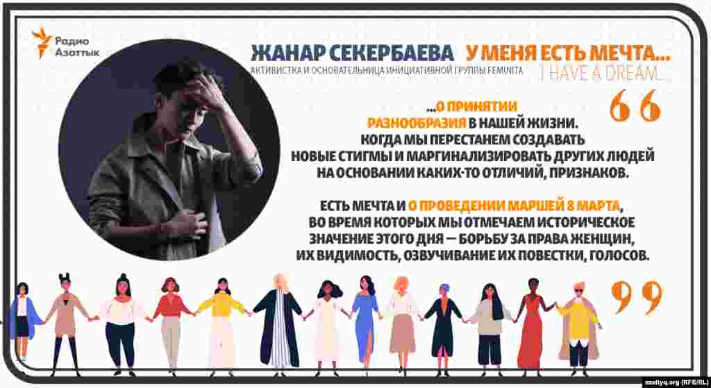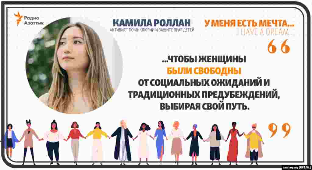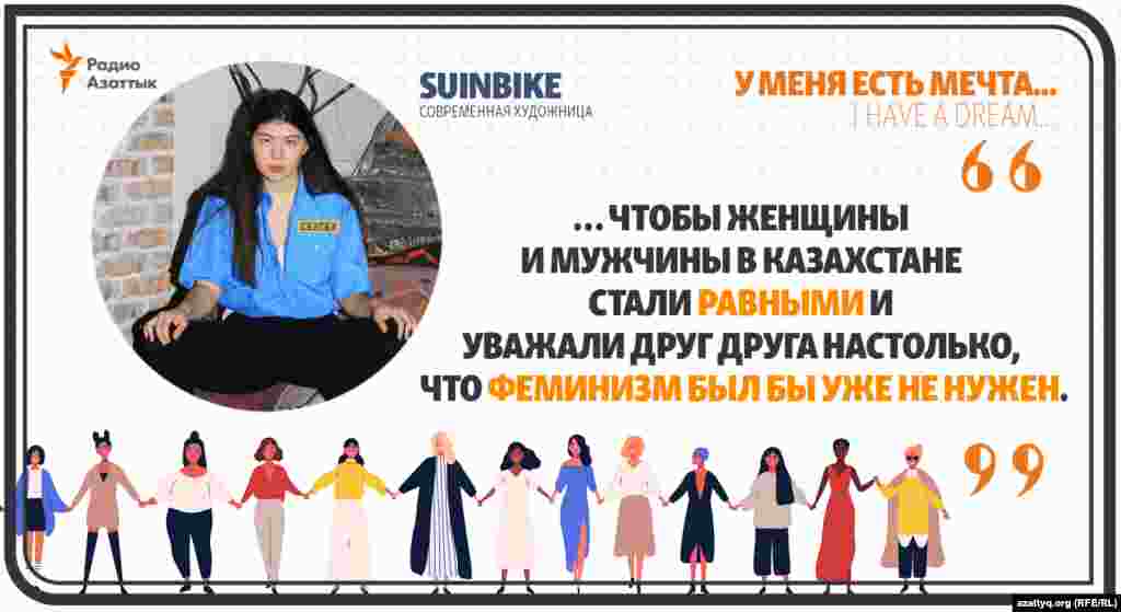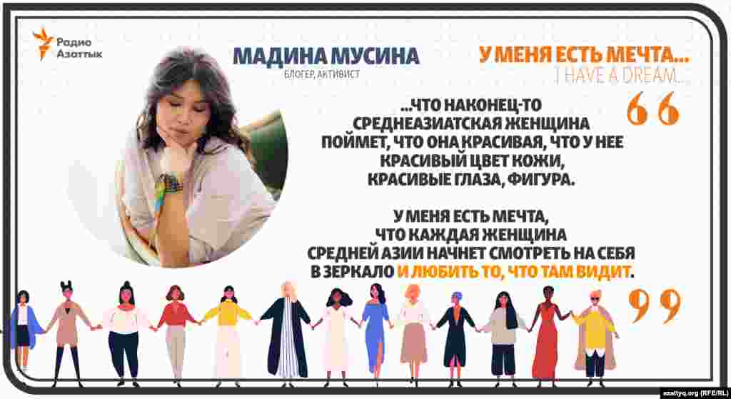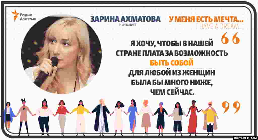 Азаттык предложил казахстанским женщинам продолжить известную фразу I have a dream... К 8 марта мы получили от 8 женщин самые разные ответы. Но все они объединены стремлением к справедливости, свободе выбора, равноправию.