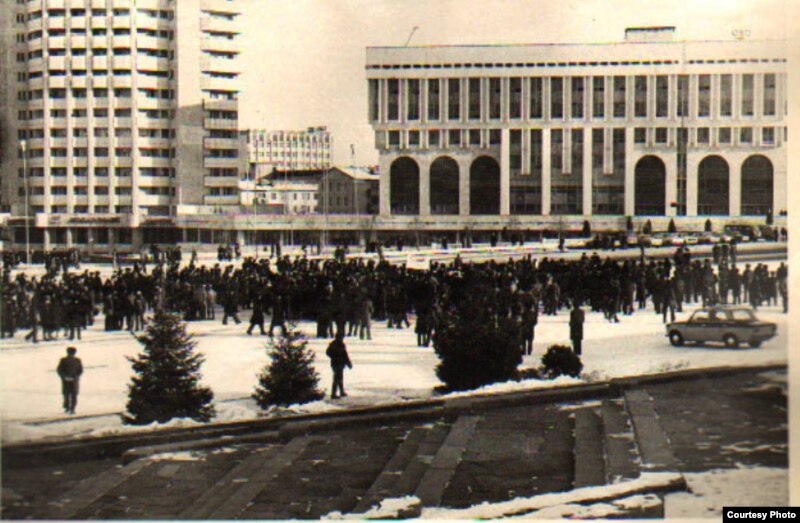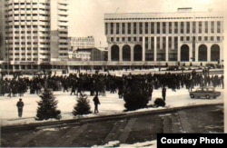Демонстрация казахской молодежи на площади Брежнева, ныне площадь Республики. Алматы, декабрь 1986 года. Фотокопия из Центрального государственного архива Алматы.