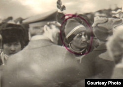 Лицо участника Декабрьского восстания казахской молодежи на фотографии с места события кем-то отмечено ручкой. Алматы, декабрь 1986 года. Фотокопия из Центрального государственного архива Алматы.