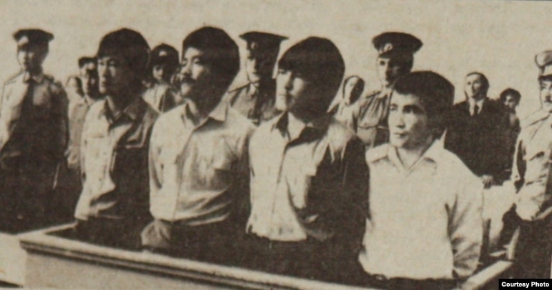 Активисты Декабрьских событий в Алматы - E. Копесбаев, T. Ташенов, K. Рыскулбеков, K. Кузембаев - на скамье подсудимых. Алматы, 16 июня 1987 года. Фото Юрия Беккера.