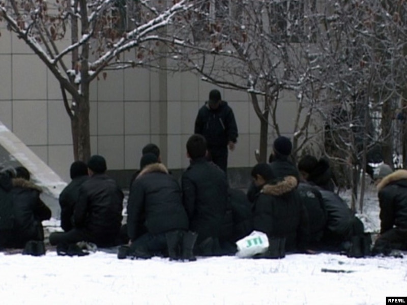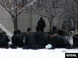 Мусульмане молятся в пятницу сидя на снегу возле мечети из-за нехватки мест внутри. Талдыкорган, декабрь 2009 года.