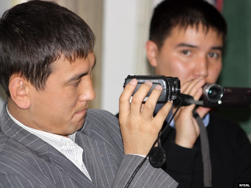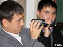 Двое в штатском снимают на видеокамеру пресс-конференцию оппозиционеров, выступивших против присвоения президенту Нурсултану Назарбаеву статуса лидера нации. Алматы, 13 мая 2010 года.