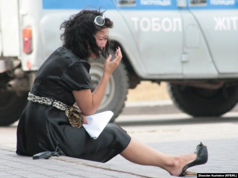 Одна из родственниц осужденных плачет, сидя на крыльце здания комитета уголовно-исполнительной системы. Астана, 14 августа 2010 года.