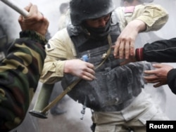 Демонстранты отбирают гранатомет у бойца полицейского спецназа. Бишкек, 7 апреля 2010 года.