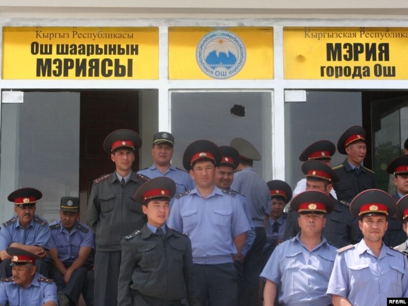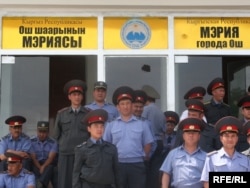 Кыргызская полиция охраняет здание мэрии города Оша. 14 мая 2010 года.