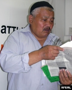 Пенсионер Оразалы Сакаев показывает документы и решения судов по судебной тяжбе с компанией Кажимкана Масимова, отца премьера Карима Масимова. Алматы, июль 2009 года.