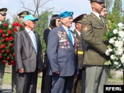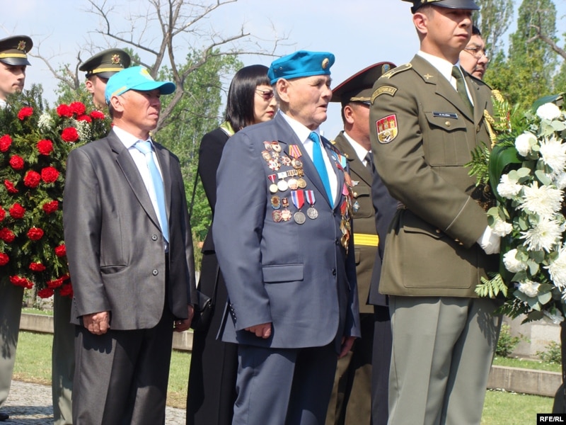 Турарбек Жунусов, племянник Героя Советского Союза Мажита Жунусова, и ветеран войны Каматай Токабаев на возложении венков на кладбище советских воинов. Прага, 9 мая 2010 года.