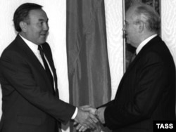 Президент СССР Михаил Горбачев и президент Казахской ССР Нурсултан Назарбаев обмениваются рукопожатиями. Москва, 25 сентября 1990 года.