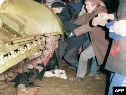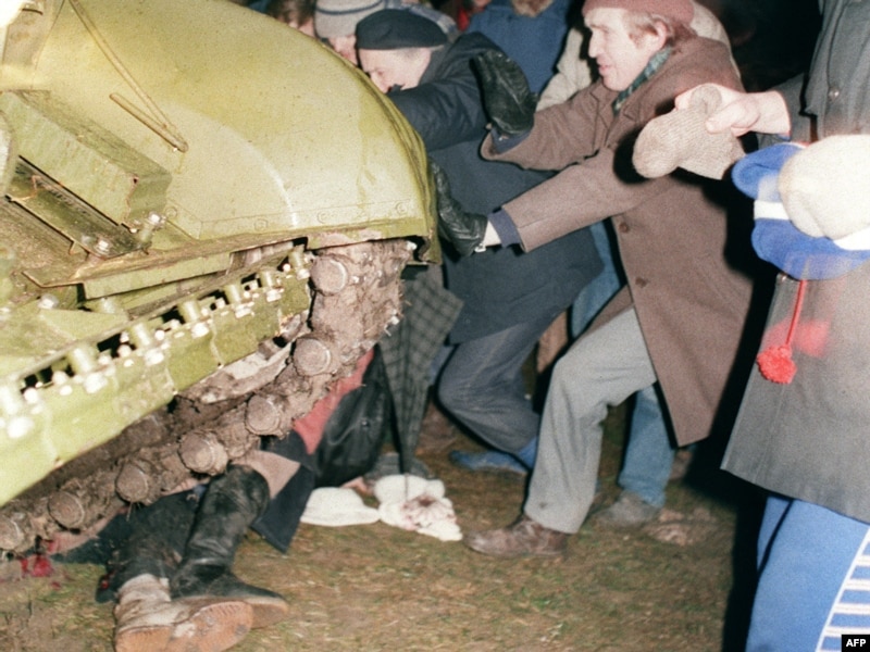 Группа литовцев пытается остановить советский танк от наезда на участника протеста при штурме советскими десантниками телебашни и телецентра. Вильнюс, 13 января 1991 года.