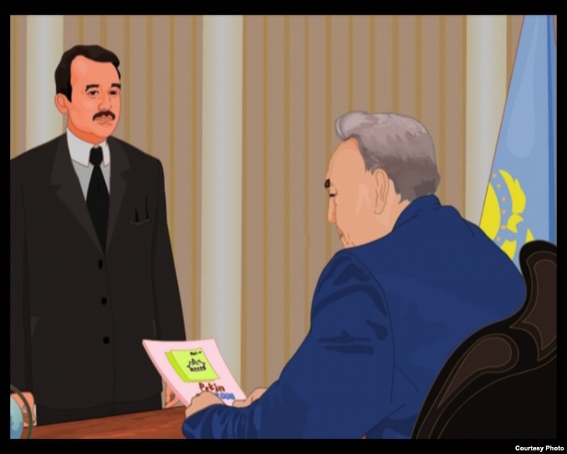 Премьер-министр Карим Масимов стоит перед президентом Нурсултаном Назарбаевым. Кадр из мультфильма «Сапа Олимпиадасы» («Олимпиада качества»), Снимки предоставила студия «Жебе» из Шымкента, где был снят мультфильм.