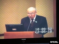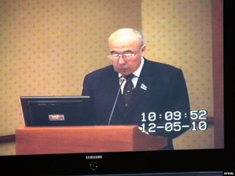 Депутат мажилиса парламента Казахстана Розакул Халмурадов зачитывает доклад о закреплении статуса "лидер нации" за Нурсултаном Назарбаевым (трансляция в пресс-центре парламента). Астана, 12 мая 2010 года.
