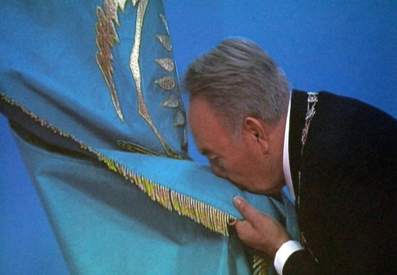 Президент Казахстана Нурсултан Назарбаев целует государственный флаг после принесения присяги народу. Астана, 8 апреля 2011 года.