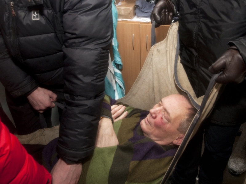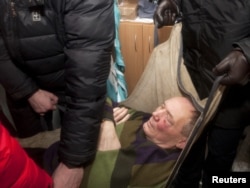 Бывшего кандидата в президенты Беларуси Владимира Некляева несут его сторонники после того, как он был избит ОМОНом возле своего офиса. Минск, 19 декабря 2010 года.