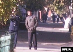 Полицейский снимает на видеокамеру собрание активистов оппозиции. Актобе, 18 октября 2009 года.