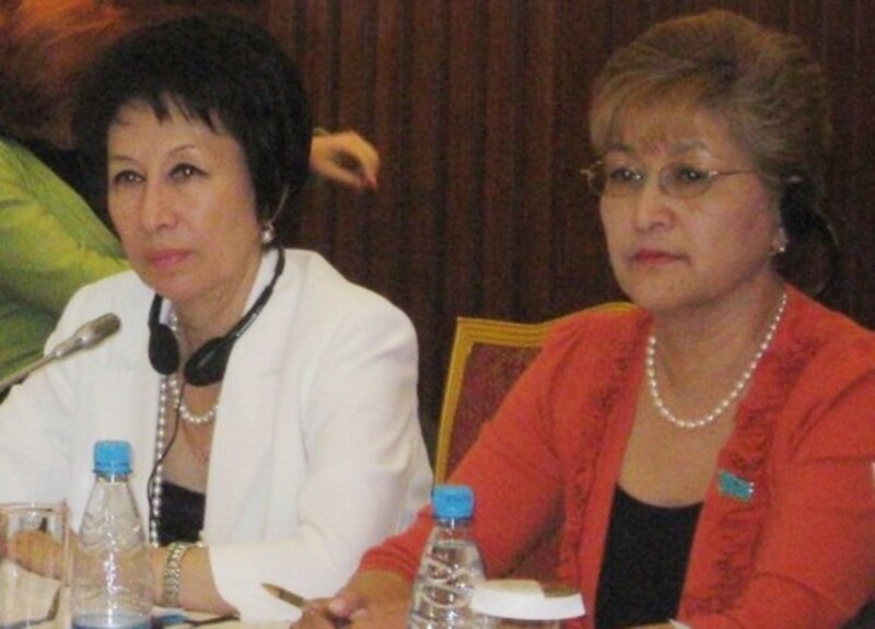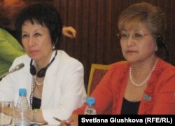 Раиса Шер, председатель комитета по охране прав детей министерства образования и науки Казахстана (слева), и Майра Айсина, депутат мажилиса парламента (справа). Астана, 27 мая 2011 года.