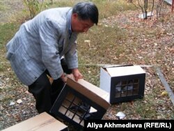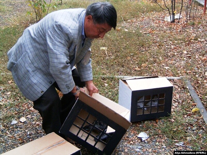 Местный активист оппозиции выпускает голубей из коробки, символизирующей тюремную камеру. Талдыкорган, 19 октября 2010 года.