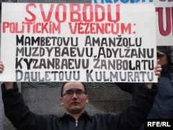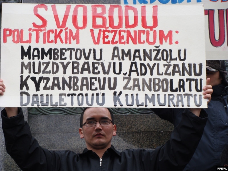 Казахские беженцы во время пикета в Праге. На плакате написано "Свободу политическим узникам: Мамбетову Аманжолу, Муздыбаеву Адильжану, Кызанбаеву Жанболату, Даулетову Кулмурату". Февраль 2009 года.