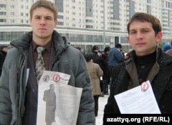 Альфред Малиновский (слева), представитель молодежного крыла незарегистрированной партии «Алга». Астана, 28 марта 2011 года.
