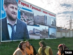 Женщины в платках сидят на фоне билборда с изображением Рамзана Кадырова. Грозный, 5 ноября 2007 года.