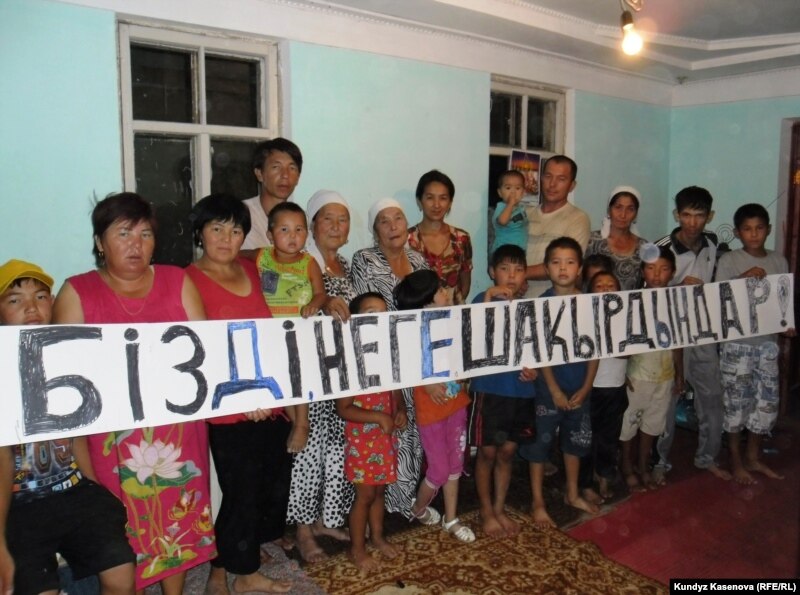 Несколько семей оралманов, пришедших поддержать семью Сакена Айбергена, держат в руках плакат с надписью: «Зачем нас позвали!» Актобе, 14 августа 2011 года.