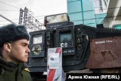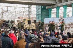 Агитационный поезд с трофеями российской армии из Сирии продолжает свой путь по городам на фоне полярных мнений о целесообразности этой «передвижной выставки». Посетителям предлагают не только посмотреть на оружие и технику, которую, как утверждает Минобороны России, изъяли у побежденных боевиков на Ближнем Востоке, но и купить футболки с портретом Путина и его цитатами. Среди последних есть и выражение «Граница России нигде не заканчивается».